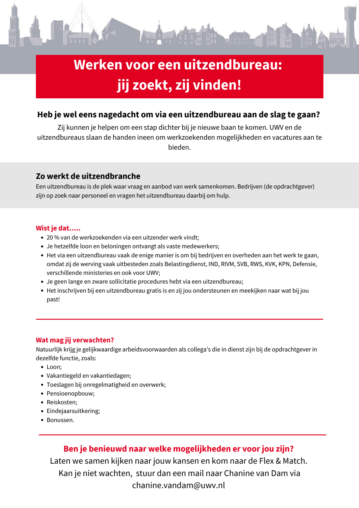Laten we samen kijken naar jouw kansen en kom naar de Flex & Match. Kan je niet wachten, stuur dan een mail naar Chanine van Dam via chanine.vandam@uwv.nl