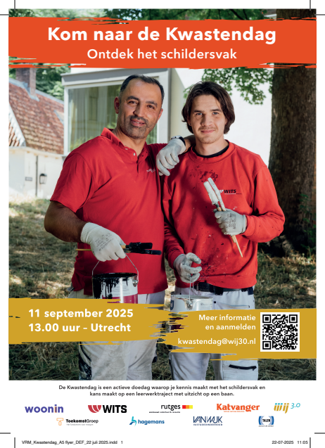 Lijkt het vak van schilder je leuk maar weet je niet zeker of het ook echt wat voor je is? Kom dan naar de Kwastendag op donderdag 11 september, om 13.00 uur in Utrecht. Voor het zevende jaar op rij organiseren we (Wij3.0) samen met Woonin en zes schilder/onderhoudsbedrijven deze actieve doe-dag waarop je kennismaakt met het schildersvak en kans maakt op een leerwerktraject met uitzicht op een baan. Heb je nog geen enkele werkervaring met schilderwerk? Geen probleem. We gaan het je leren!