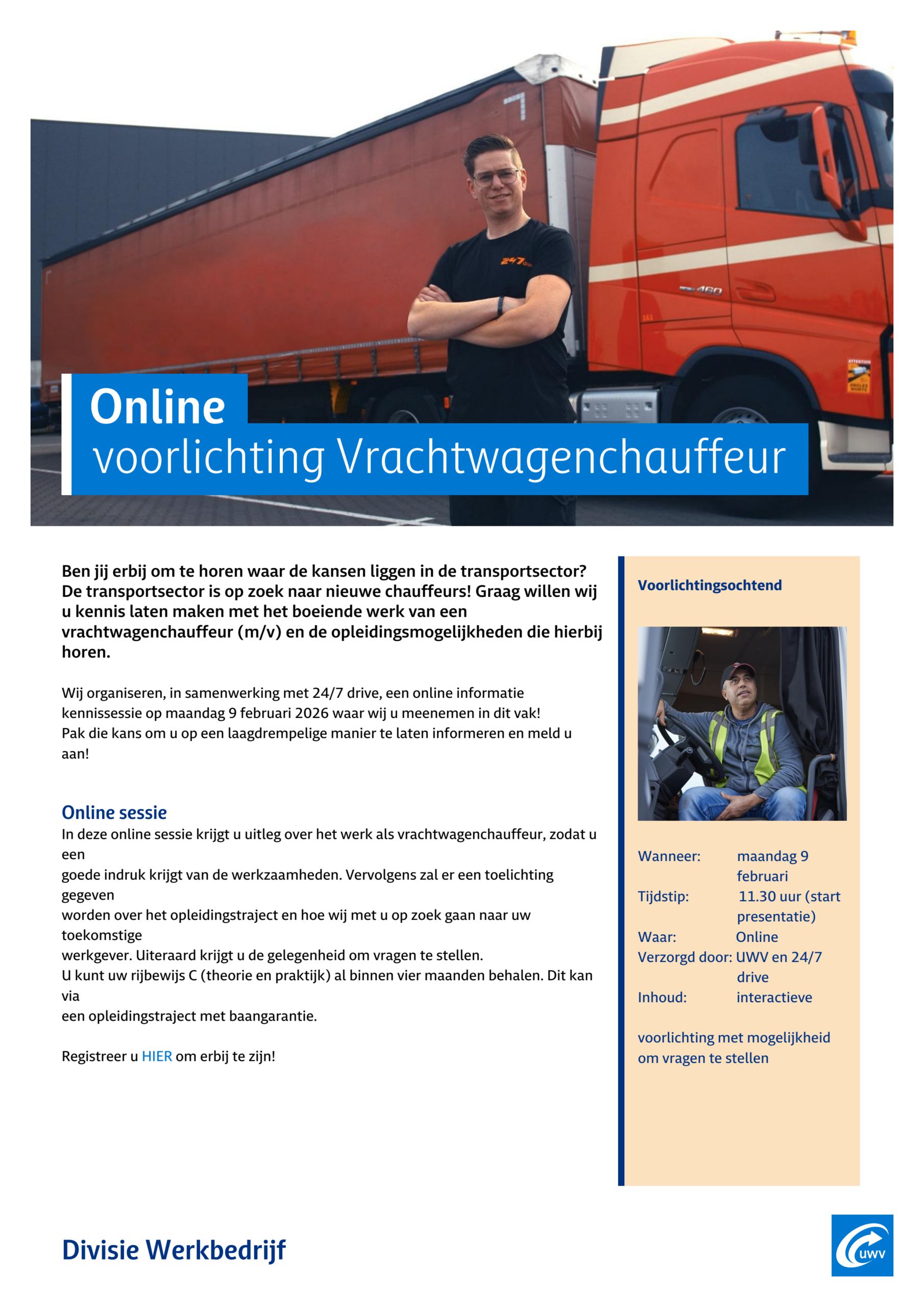 Wij organiseren, in samenwerking met 24/7 drive, een online informatie kennissessie op maandag 9 februari 2026 waar wij u meenemen in dit vak! Pak die kans om u op een laagdrempelige manier te laten informeren en meld u aan!