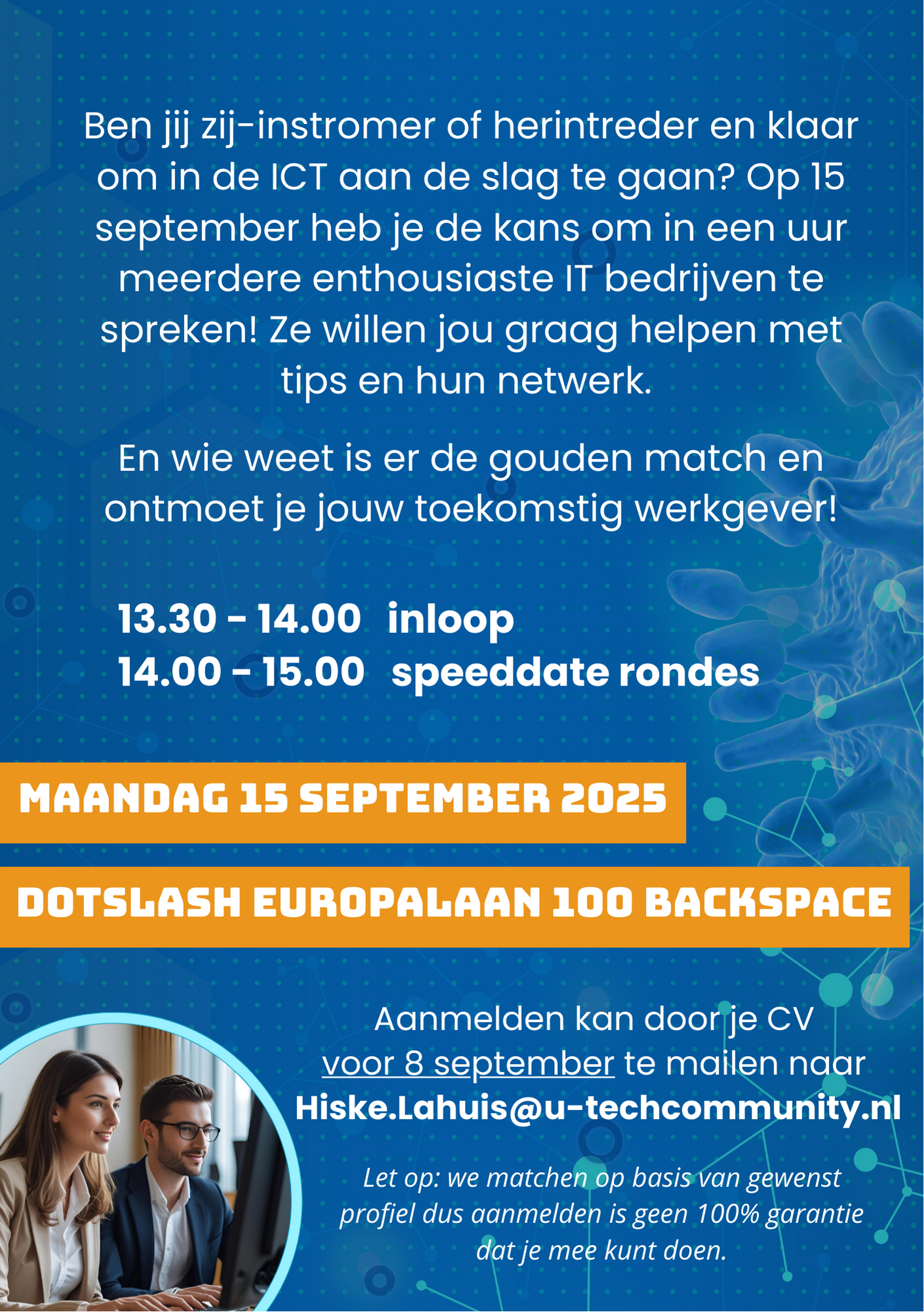 Ben jij zij-instromer of herintreder en klaar om in de ICT aan de slag te gaan? Op 15 september heb je de kans om in een uur meerdere enthousiaste IT bedrijven te spreken! Ze willen jou graag helpen met tips en hun netwerk.