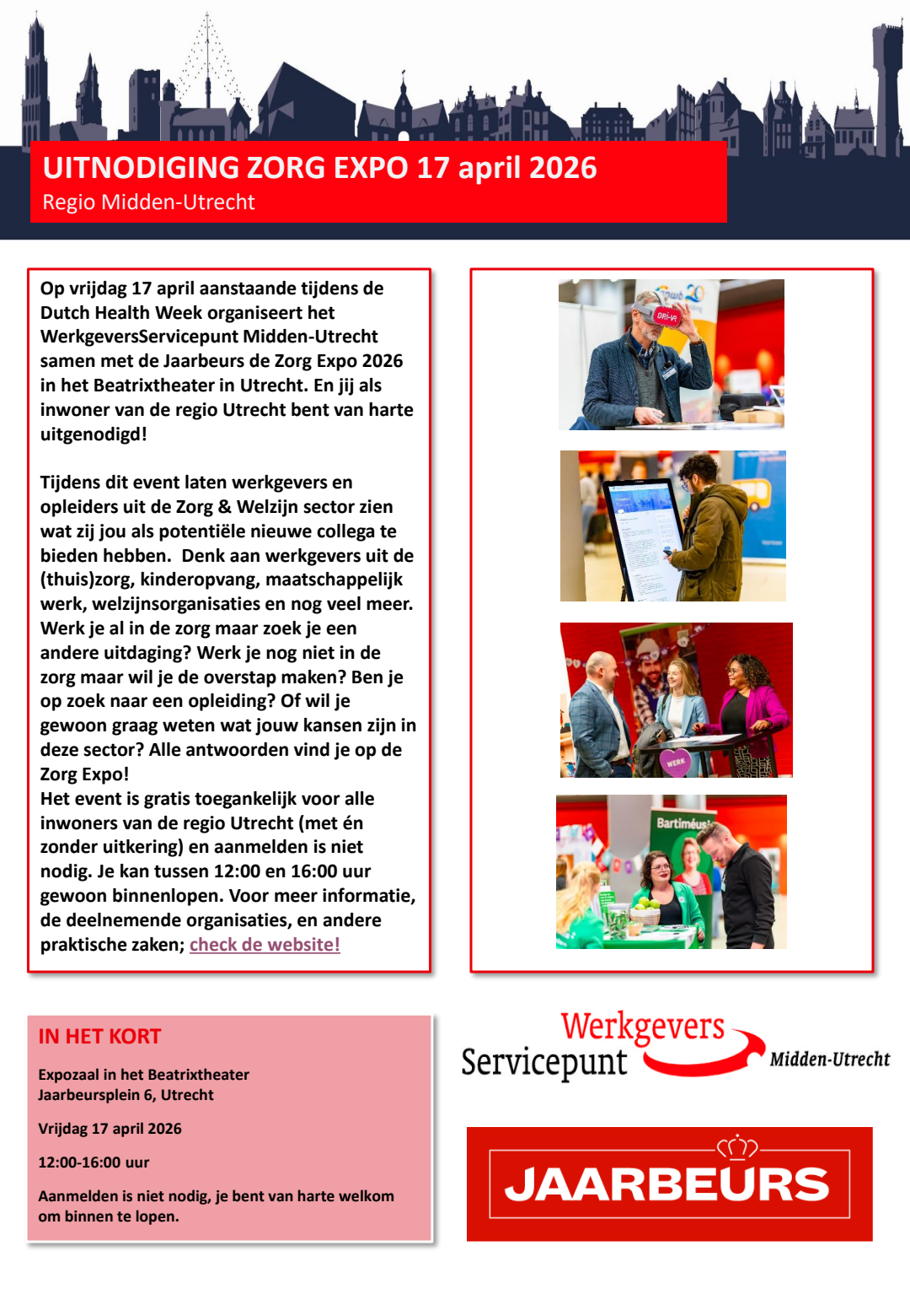 Op vrijdag 17 april aanstaande tijdens de Dutch Health Week organiseert het WerkgeversServicepunt Midden-Utrecht samen met de Jaarbeurs, Utrechtzorg, gemeente Utrecht, UWV en de Utrecht Talent Alliantie de Zorg Expo 2026 in het Beatrixtheater in Utrecht. En jij als inwoner van de regio Utrecht bent van harte uitgenodigd!